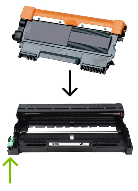 Verwijder de lege toner door links (bij groene pijl) op de "release" knop (groen) te drukken. Verwijder de oude/lege toner. Plaats nu de nieuwe toner na het verwijderen van de beschermkap (oranje) en plaats de nieuwe toner. De cassette klikt vanzelf in de drum. U hoeft de release knop niet in te drukken.